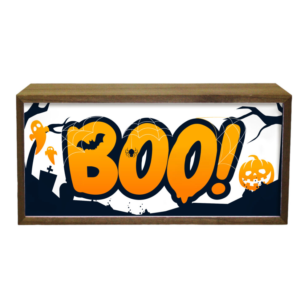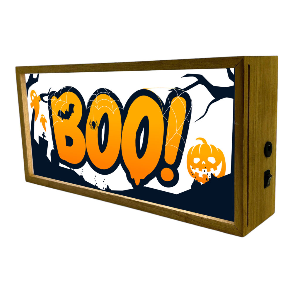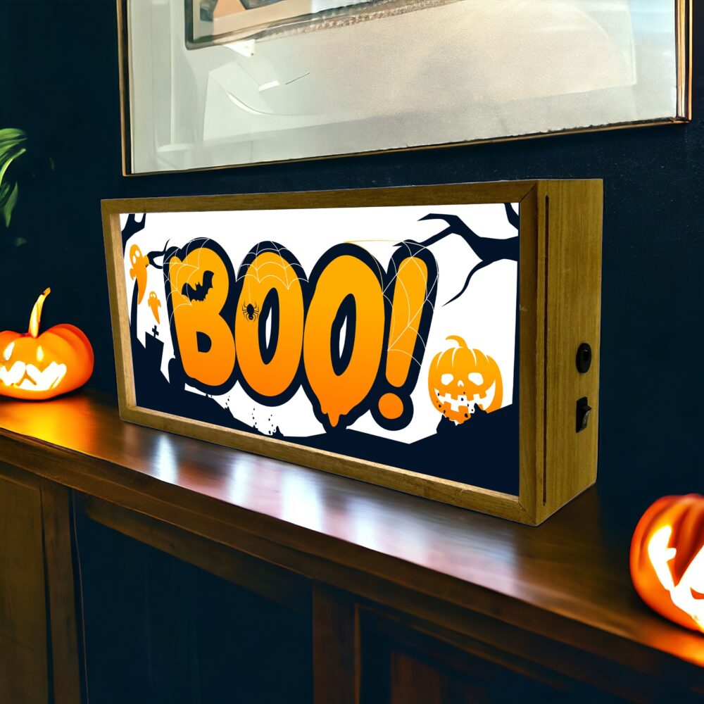 Light Box Home Halloween Boo is an eye-catching illuminated LED room sign perfect for adding a spooky touch to your Halloween décor. Halloween decor, measuring 300 mm wide, 150 mm tall, and 70 mm deep, this light box features a fun and eerie “Boo” design that brings a haunted house vibe to any space. Its bright LED lighting ensures high visibility, making it an ideal centre piece for hallways, living rooms, or pumpkin-themed displays. Portable and versatile, the sign can be powered by either batteries or a USB connection, allowing for flexible placement and easy setup.