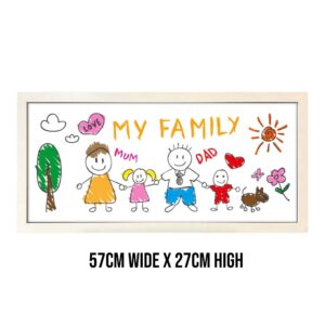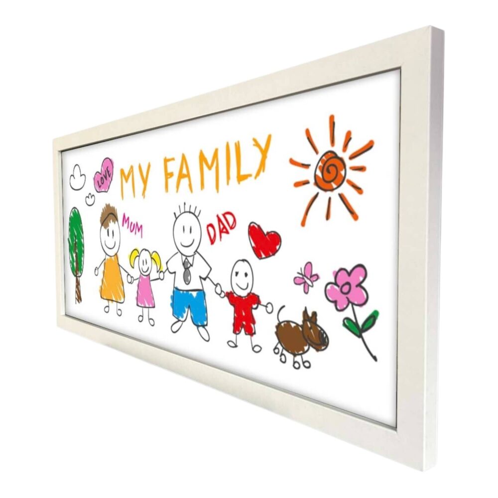Available in sleek black or white wooden frames, the rectangular landscape format fits seamlessly into any playroom, bedroom, hallway, or family gallery wall. Whether celebrating a milestone like first day of school, homework achievements, or just a spontaneous scribble, this personalised print is a fun and meaningful addition to your home.