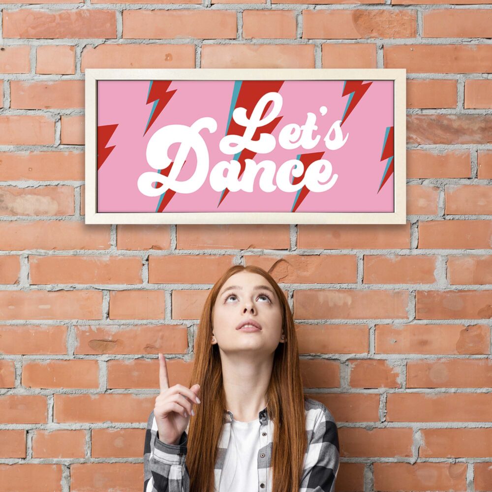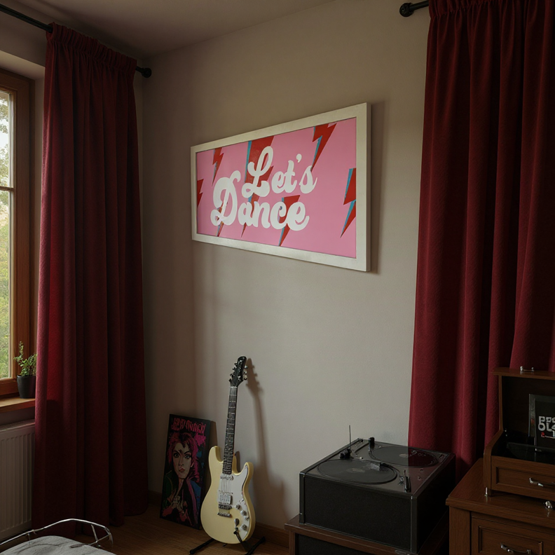 The Wall Art Framed Print Home Let’s Dance is a vibrant tribute to music and celebration, featuring a retro Bowie-inspired design that captures the essence of 70s culture. This striking piece is perfect for Bowie fans or anyone who loves to dance. A delightful gift for yourself or a loved one, it brings the party vibe home and inspires joyful everyday moments.